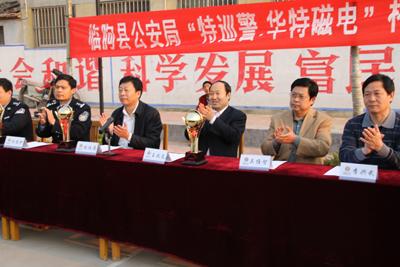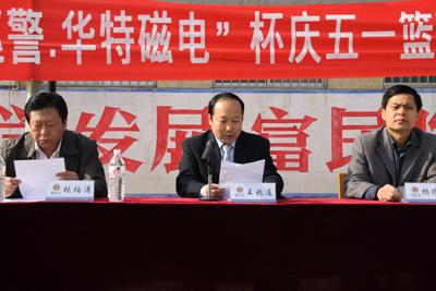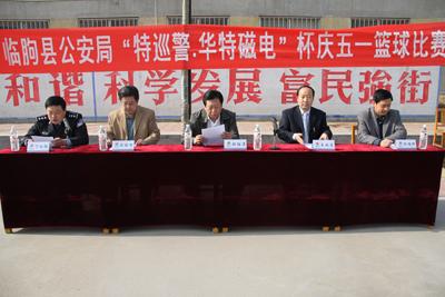 4月29日上午,由公司協辦的臨朐縣公安局“特巡警·華特磁電”杯慶五一籃球比賽在東城區吳家廟籃球場舉行。縣公安局政委張伯濤、縣公安局副局長楊維護,我公司董事長兼總經理王兆連出席開幕式。王兆連董事長在開幕式上講話,代表公司向大賽表示祝賀并?;@球賽圓滿成功。