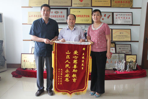 6月5日,九山鎮黨委委員、副鎮長衣燕與九山鎮教管辦領導來公司為公司董事長兼總裁王兆連送來錦旗,上面繡有“愛心慈善助教育,山區人民永感恩”,對王兆連董事長表示感謝。