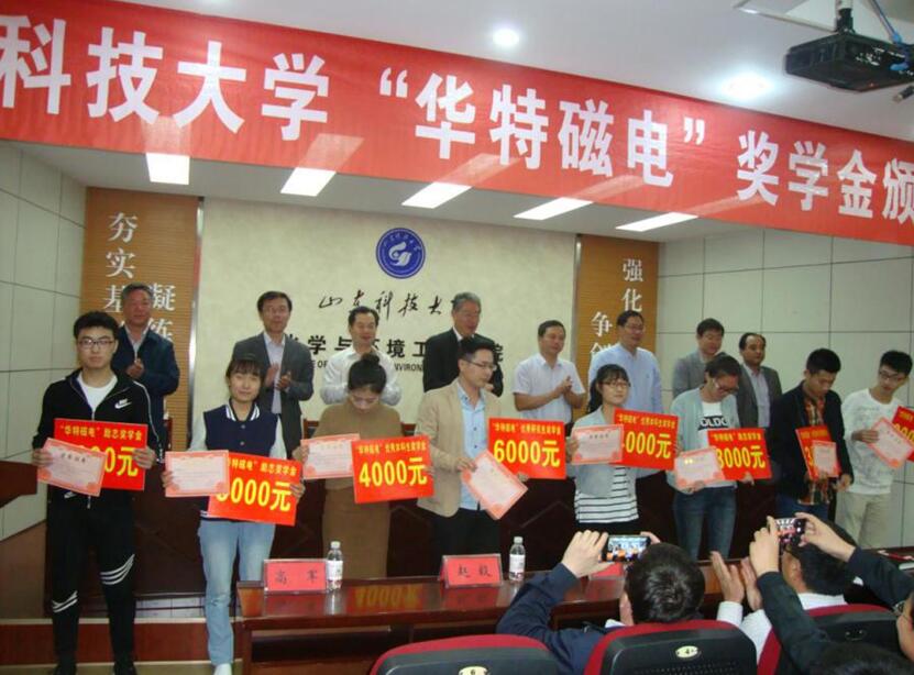 根據(jù)公司與山東科技大學(xué)簽訂的“華特磁電”獎學(xué)金使用辦法,本次獎學(xué)金發(fā)放給化學(xué)與環(huán)境工程學(xué)院的在校學(xué)生。這是公司在山東科技大學(xué)頒發(fā)的第二屆“華特磁電”獎學(xué)金。山東科技大學(xué)黨委副書記李道剛,學(xué)生工作部、校團(tuán)委、教務(wù)處、合作發(fā)展處、化工學(xué)院負(fù)責(zé)人出席會議,會議由化工學(xué)院黨委副書記竇存增主持。獲獎學(xué)生以及礦物加工工程系教師、研究生、本科生代表參加會議。