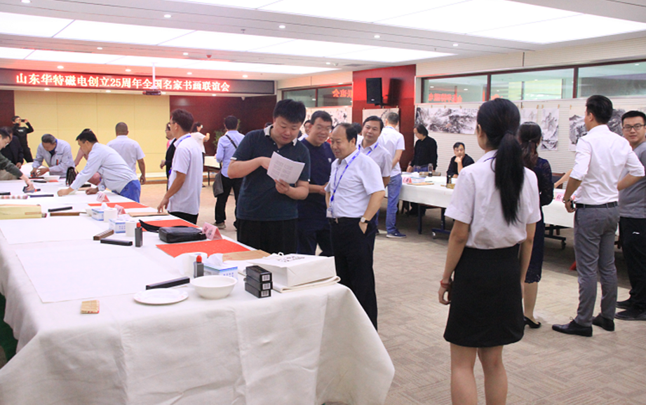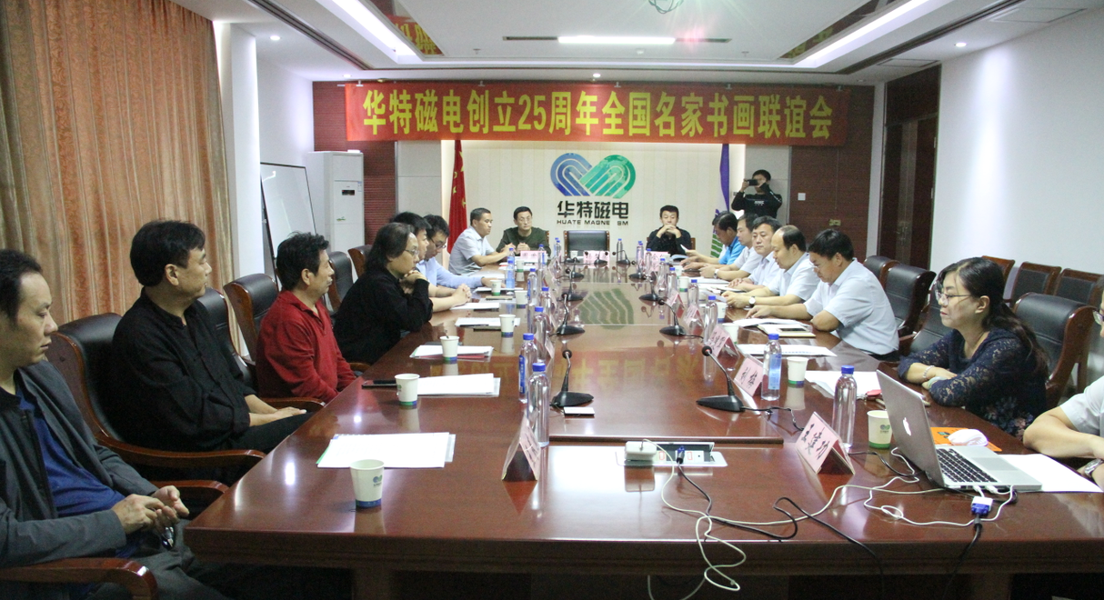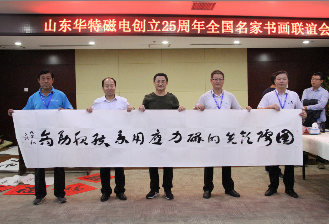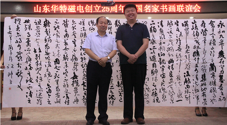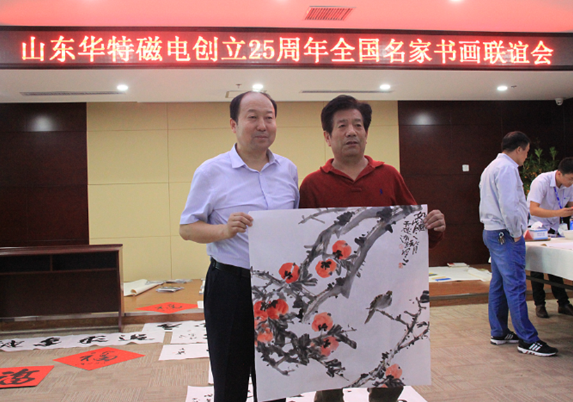 座談會上,王兆連董事長代表華特公司各位股東以及全體員工,向出席本次活動的各位領導以及書畫界的專家們表示熱烈歡迎。并表示,公司自1993年8月8日創立至今,歷經25年風霜雪雨,在各級黨委、政府的大力支持下,在社會各界的熱情幫助下,在全體員工的不懈努力下,取得了跨越式發展,由創業之初的一間辦公室、兩間茅草屋發展成為知名的磁電裝備制造業領軍企業。二十五年的艱辛歷程凝練出了華特特有的,具有旺盛生命力、務實、高效、團結的企業文化。此次聯誼會的成功舉辦,是各位書畫名家用精美作品向華特公司25周年華誕獻上的一份精神厚禮,這將作為慶?!叭A特創立25周年”宣傳紀念活動的重要組成部分,在公司創新發展歷程上留下濃墨重彩的一筆。今天有幸借此機會,同所有的書畫愛好者們,一起分享各位德藝雙馨的書畫藝術家帶來的全新視覺體驗,領略藝術美的韻味,感受傳統文化的魅力!