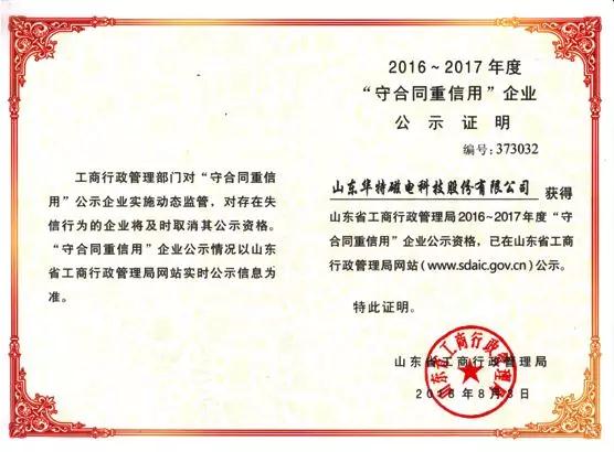根據(jù)《山東省守合同重信用企業(yè)公示辦法》,山東省工商局決定,向社會公示2016~2017年度“守合同重信用”企業(yè)共5487戶,山東華特磁電科技股份有限公司榜上有名。本次被認定為“山東省守合同重信用企業(yè)”是對公司近兩年在合同信用管理、合同履約、經(jīng)濟效益、社會責(zé)任和信用信譽等工作的重大肯定,是公司誠信履約、守法經(jīng)營的重大體現(xiàn),進一步增強了公司的知名度,提高了公司的軟實力。