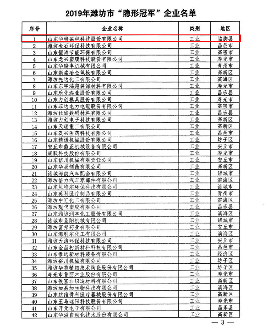 近日,濰坊市“隱形冠軍”企業培育推進工作聯席會議辦公室以濰隱聯辦發﹝2019﹞2號文件《關于公布2019年濰坊市“隱形冠軍”企業的通知》,山東華特磁電科技股份有限公司被認定為市級“隱形冠軍”企業。根據《濰坊市“隱形冠軍”企業群培育方案》(濰政辦字﹝2018﹞19號),公司將獲得市財政一次性獎勵50萬元。
